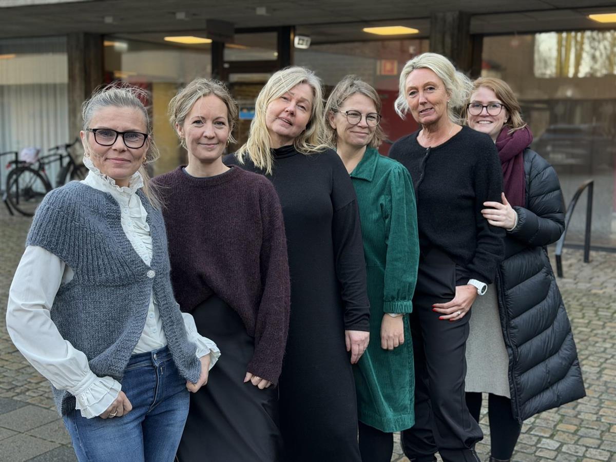 Bildet: Friskus-team i kommunen (fra venstre til høyre): kommunikasjonsrådgiver Anastassia Dyrkorn, kommunikasjonsrådgiver Renate Holtet, Rådgiver (lavterskeltilbud psykisk helse/-avhengighet -mossehjelpa) Mette Filtvedt, administrasjonskonsulent kommunalområdet Helse og mestring Mette Larsen, administrasjonskonsulent virksomhet kultur og idrett Grethe Reinnel, frivillighetskoordinator Ida Madeleen Moe