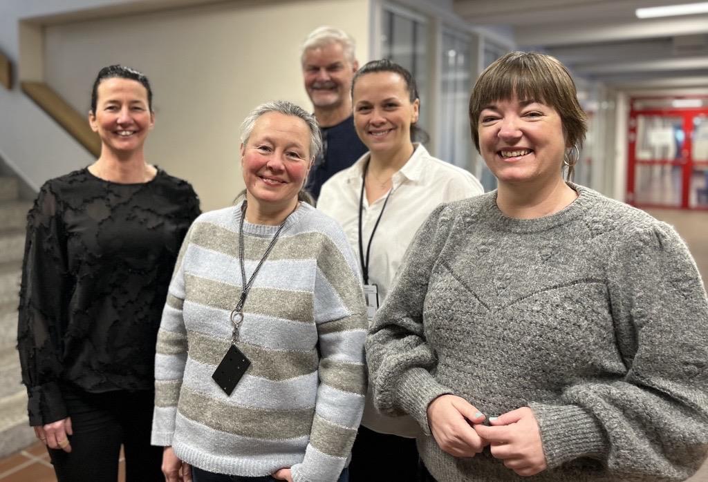 På bildet (fra venstre): Janne Borgen (avdelingsleder hjemmesykepleie), Mette Frydenberg (digitaliseringsrådgiver, IT), Thea Davidsen (spesialkonsulent velferdsteknologi, avdeling e-helse), Ruth Helen Thorheim (prosjektleder og leder avdeling e-helse). Bak: Kjartan Slang (tjenesteutvikler og prosjektleder, avdeling e-helse)