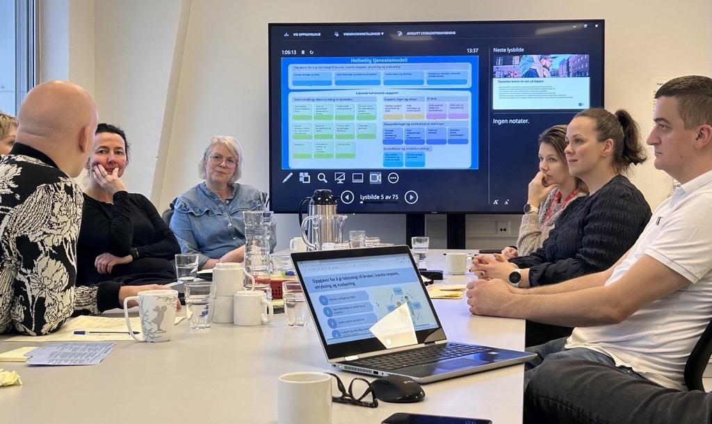 Møte i den tverrfaglige arbeidsgruppen som har som oppdrag å jobbe frem organisering og nye arbeidsprosesser for digital hjemmesykepleie. F.v.: Peter Michael Onstad Shovick, Ljudmila K. Nielsen, Janne Borgen, Vigdis Marie Jarl, Henriette Wang Hermansen, Thea Davidsen og Milan Jovanovic