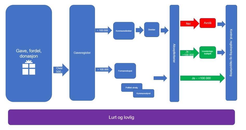 Videre deles prosessen etter beløpsstørrelse. Gaver med verdi under 100 000 kroner behandles av kommunedirektør og deretter direktør. Gaver med verdi over 100 000 kroner behandles av formannskapet, og kan også behandles videre i politisk utvalg og kommunestyret.